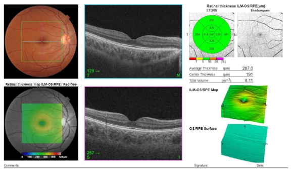 - Bệnh lỗ hoàng điểm: xác định được lỗ hoàng điểm và đo được kích thước đồng thời thấy được co kéo dịch võng mạc gây ra lỗ hoàng điểm và chiều dày võng mạc xung quanh.