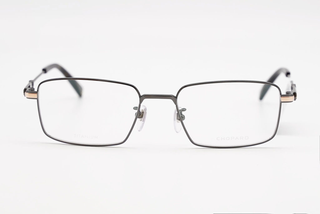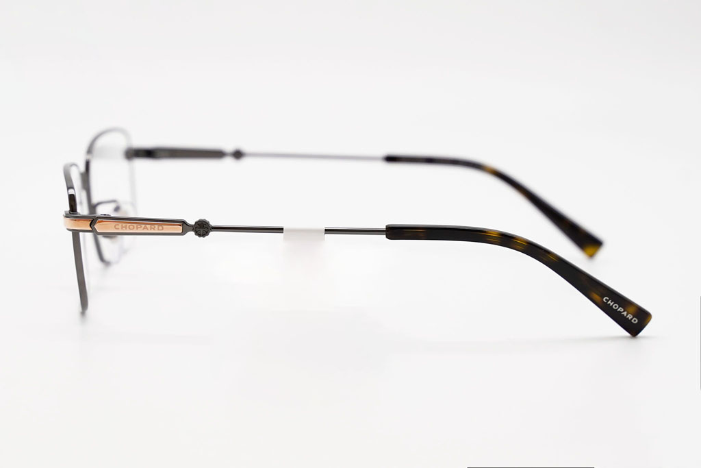 Thiết kế gọng dạng chữ nhật thanh mảnh, sử dụng Titanium xám đen (gunmetal) siêu nhẹ, kết hợp điểm nhấn vàng hồng (Rose Gold) khắc logo CHOPARD tinh xảo trên càng kính. Phần đuôi càng acetate vân nâu tortoiseshell tạo chiều sâu thẩm mỹ, đồng thời tăng độ êm ái và bám tai khi đeo.